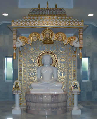 No one photo could be found to truly epitomise the pratishta mahotsav however there are several thousand of the pratishta in the photo resource section. The result of our pratishta can be seen below with a 61" pure white marble pratishthit pratima of Mahavir Bhagwan backed by a gold-leaf floating bhamandal with pratimas of Prashvanath and Mahavir Bhagwans in front.